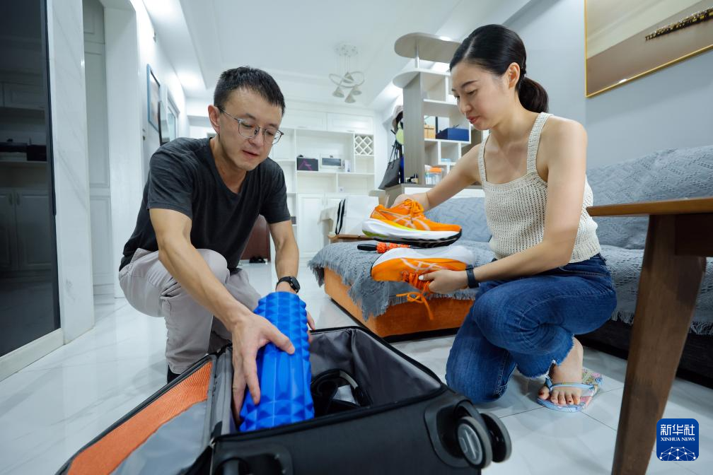 陈志刚(左)和妻子罗丹丹在家中准备前往巴黎参加比赛的行李(7月17日摄)。新华社记者 沈伯韩 摄