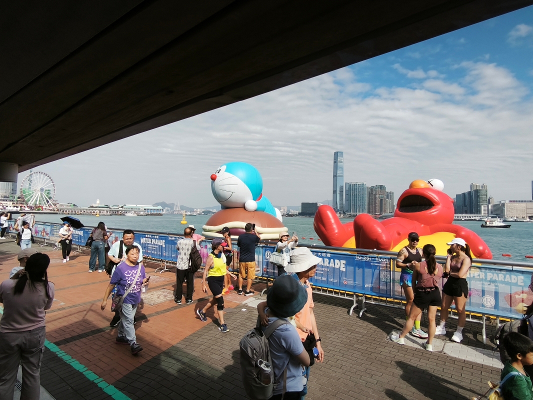 “維港海上大巡游”活動25日起亮相香港金鐘添馬公園海濱,4個巨型充氣公仔包括多啦A夢、KAWS & 芝麻街(Elmo)、滑嘟嘟及LABUBU