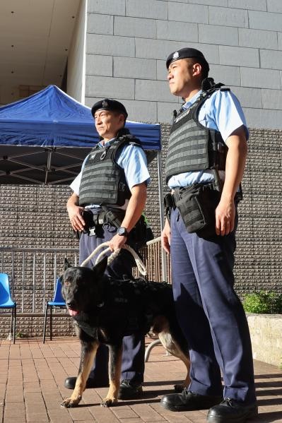 大批公眾人士按秩序準備入場旁聽。現場亦有便利分割隊流的通道安排,數十名警員荷槍實彈,維護秩序,法院門口附近亦有警察牽引警犬排查。法院門口的道路車輛限流,轉為單行道,數輛警車沿著街道一側停於附近,對整條街道進行佈防。(完)