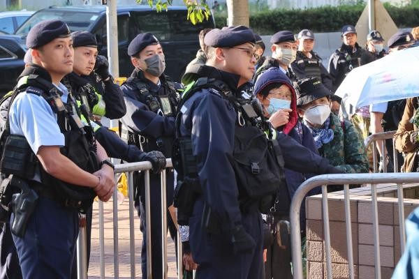 12月15日,壹傳媒創辦人黎智英與《蘋果日報》3間相關公司涉嫌串謀勾結外國勢力案今早宣佈判決,西九龍裁判法院外保安措施顯著加強,多名穿著防刺戰術背心的警員在場巡邏,警方亦設置路障,所有進入法庭的車輛,均需接受安檢。(記者 謝光磊 攝)