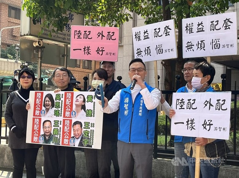 2024年3月12日,台灣新黨成員游智彬在台陸委會所在辦公大樓前發起聲援,支持陸配入籍年限縮短。台灣“中央社”資料圖