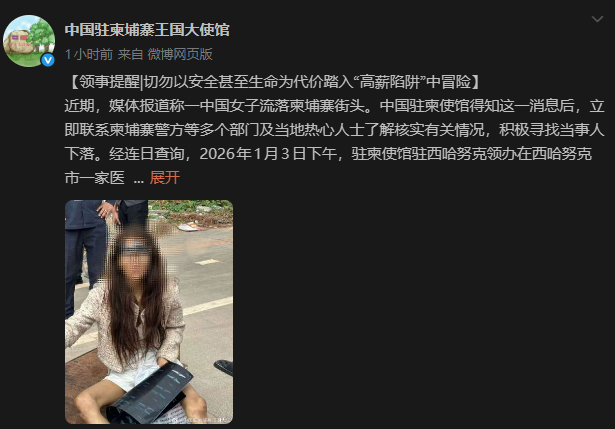 使館方面表示,發現時該女子身體狀況很差,領辦當即協調將其轉送至另一家醫院救治。據該女子反映,其受“高薪工作”誘惑來柬,後流落街頭。目前,該女子身體狀況有所好轉,領辦已聯繫其家屬來柬辦理接其回國事宜。