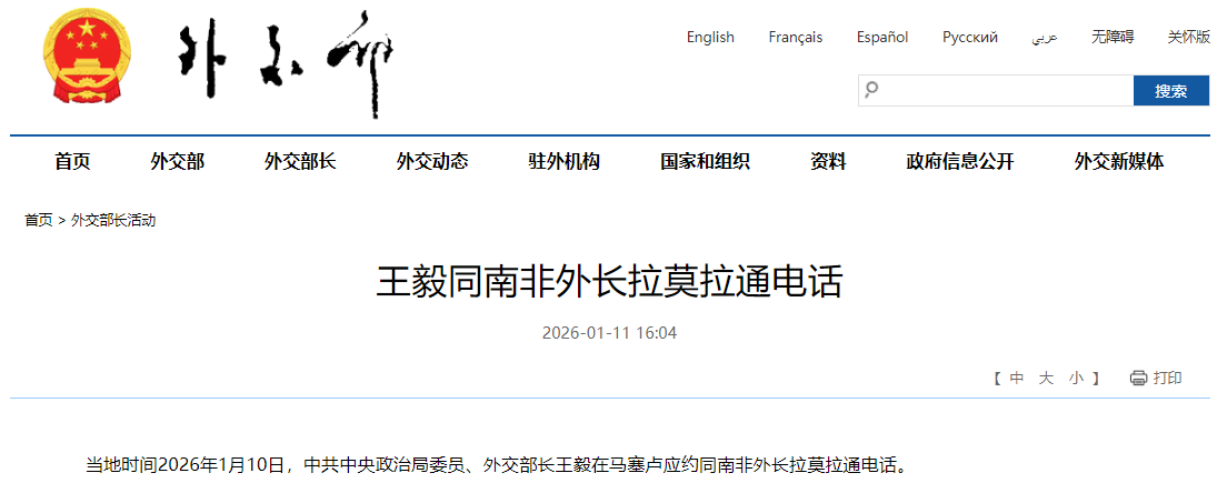 香港中通社1月11日電 中國外交部長王毅當地時間10日在馬塞盧應約同南非外長拉莫拉通電話,表示雙方要共同辦好“中非人文交流年”,夯實中南和中非友好的民意基礎。