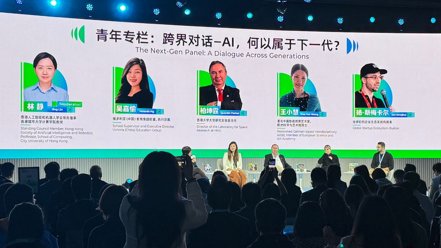 香港人工智能和機器人學會常務理事兼城市大學教授林靜(左一)、維多利亞(中國)教育集團校董兼執行總監吳嘉愉(左二)等專家出席2026 WAIC UP!年終盛會。香港新聞網記者 梁嘉軒攝
