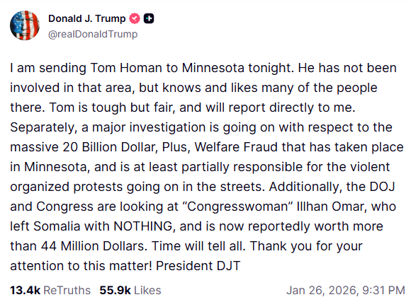 另外,特朗普同日又表示,已與明尼蘇達州州長沃爾茲通話,兩人在處理移民問題上“實際上”似乎已達成共識,並希望攜手合作;又指政府正追捕所有罪犯,沃爾茲非常尊重並理解這一點;沃爾茲表示,同特朗普進行了富有成效的通話,指特朗普會考慮減少派遣到明尼蘇達州的移民執法人員數目,又同意與國土安全部對話,以確保明尼蘇達州能對這宗槍擊案展開獨立調查。(完)