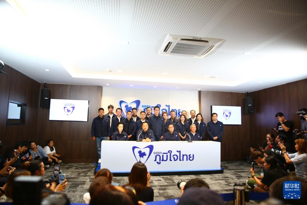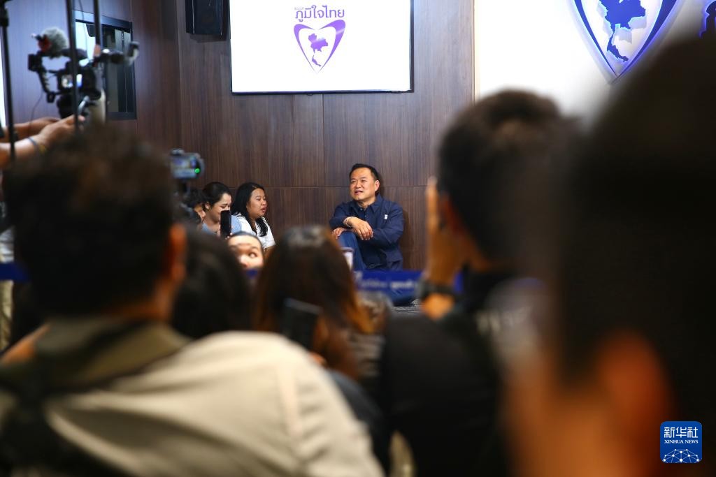 2月8日,泰國看守政府總理、自豪泰黨黨首阿努廷(前左二)在曼谷出席新聞發佈會。新華社記者 萬後德 攝
