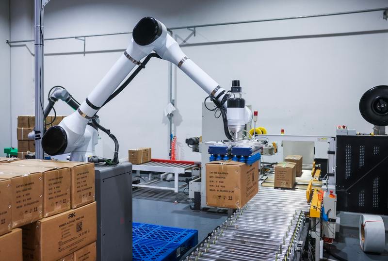 資料圖為自動化打包機器人在打包產品。圖片來源:新華社