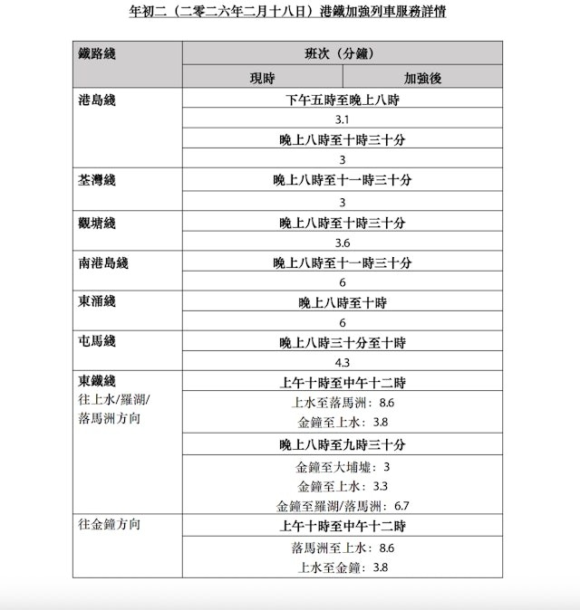 其中荃灣綫晚上8時至11時半,大約每3分鐘一班車;港島綫晚上8時至10時半,大約每3分鐘一班車;東鐵綫晚上8時至9時半,金鐘至上水約每3.3分鐘一班車,金鐘至羅湖/落馬州方向,約每6.7分鐘一班車。