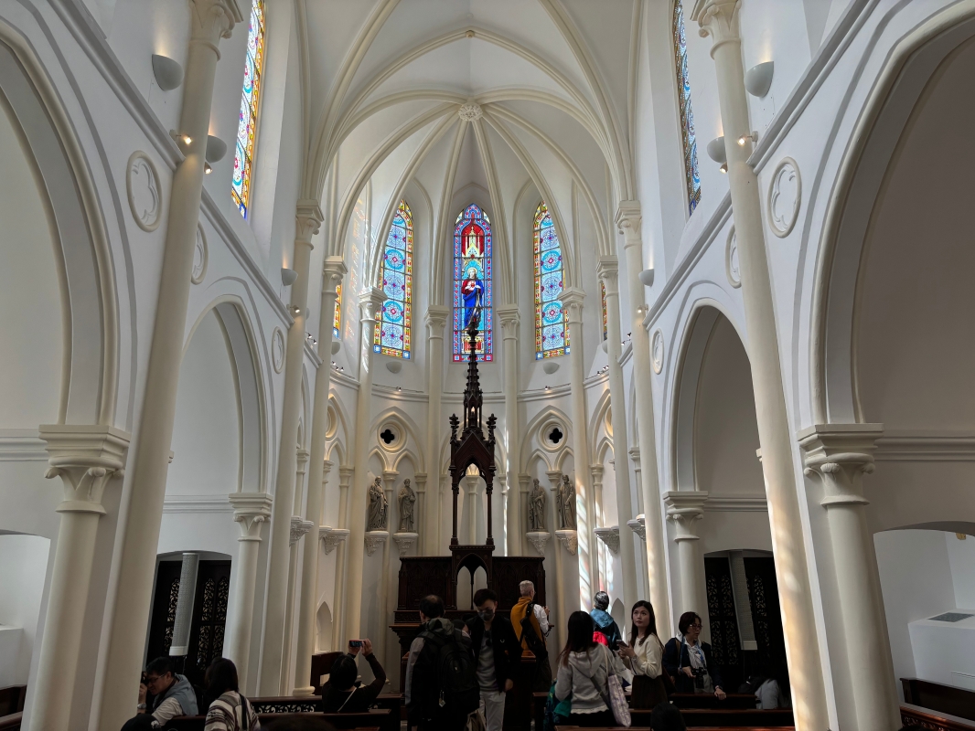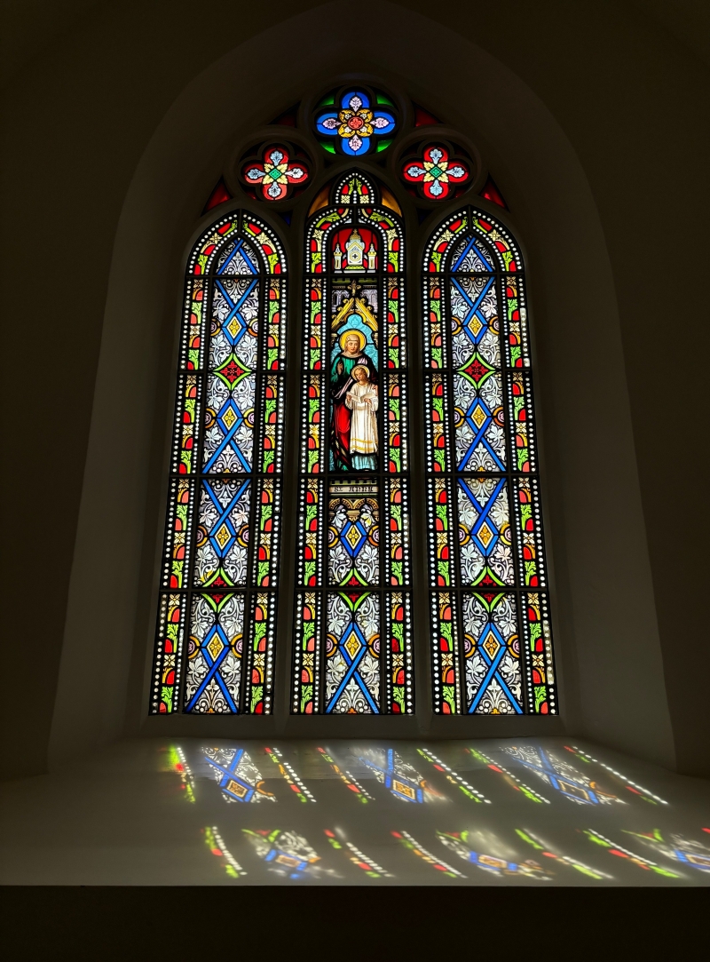 走進小教堂,陽光透過彩繪玻璃灑落,在地磚上投下斑駁光影。這十九扇玻璃窗,背後藏著一段曲折的故事——修院關閉後原窗全部散失,復修團隊經過三年搜尋,竟在共濟會“雍仁會館”發現七扇,政府倉庫中還有兩扇。查訪下發現,1985年有位建築師在置富花園發現這批玻璃窗,存放於政府倉庫,其後為“雍仁會館”裝修時申請使用其中七扇。