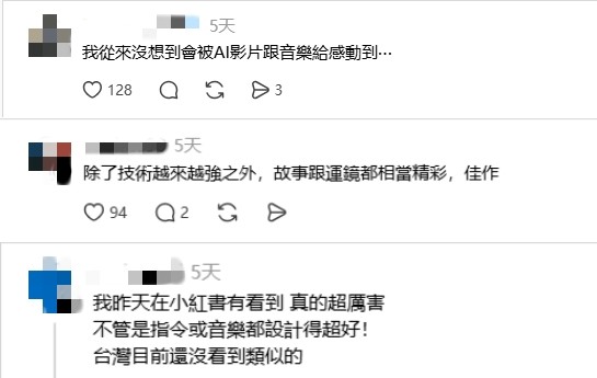 評論區的台灣網友也紛紛表示,“除了技術越來越強之外,故事跟運鏡都相當精彩,佳作!”“怎麼會那麼厲害啊!果然只要有良好的分鏡跟敘事手法,AI就是強大的工具!”“真的超厲害,可惜在台灣還沒看到類似的作品。”