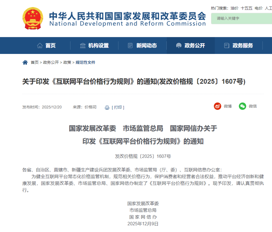 關於印發《互聯網平台價格行為規則》的通知。圖源:中國國家發改委網頁截圖