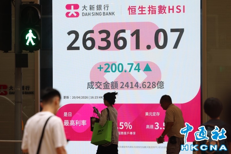 香港中通社4月20日電(記者 譚暢)市場觀望美伊新一輪會談發展,港股20日高開後反覆向上,恆生指數當日升200點或0.77%,報26361點。大市全日成交額約為2414.63億港元。
