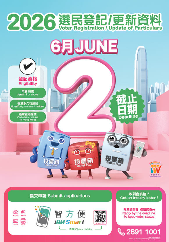 香港新聞網4月22日電 2026年選民登記運動22日展開。選舉事務處呼籲合資格的個人或團體,如尚未登記為地方選區、功能界別及/或選舉委員會界別分組選民/投票人,盡早於法定限期六月二日或之前提交登記申請,其登記資料方可被納入今年九月發表的正式選民/投票人登記冊。
