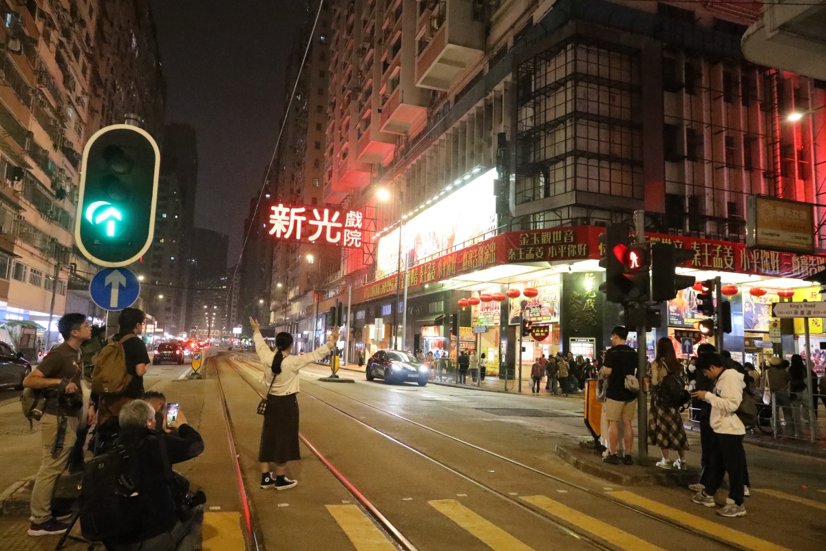夜幕降臨電車駛過新光戲院,新光戲院將在3月3日閉門落幕。