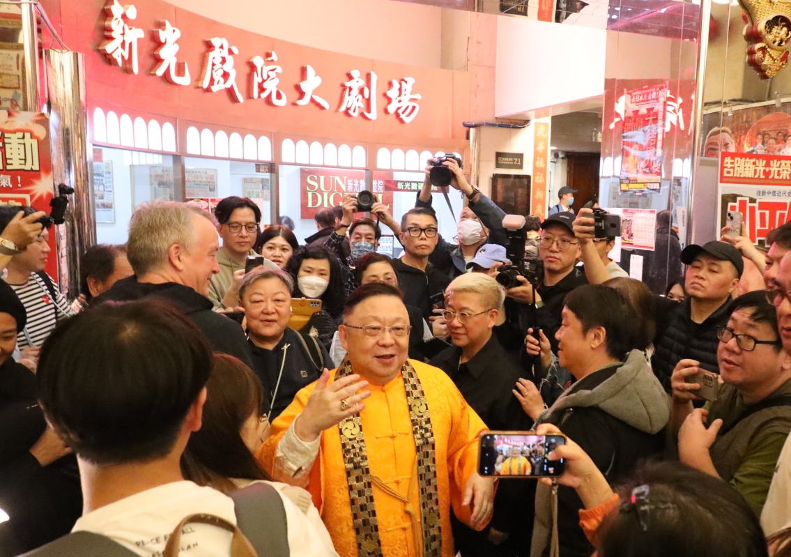 3月1日晚,經營該戲院12年的“新光戲院大劇場”主席李居明現身,受到場內場外的無數粵劇迷歡迎。