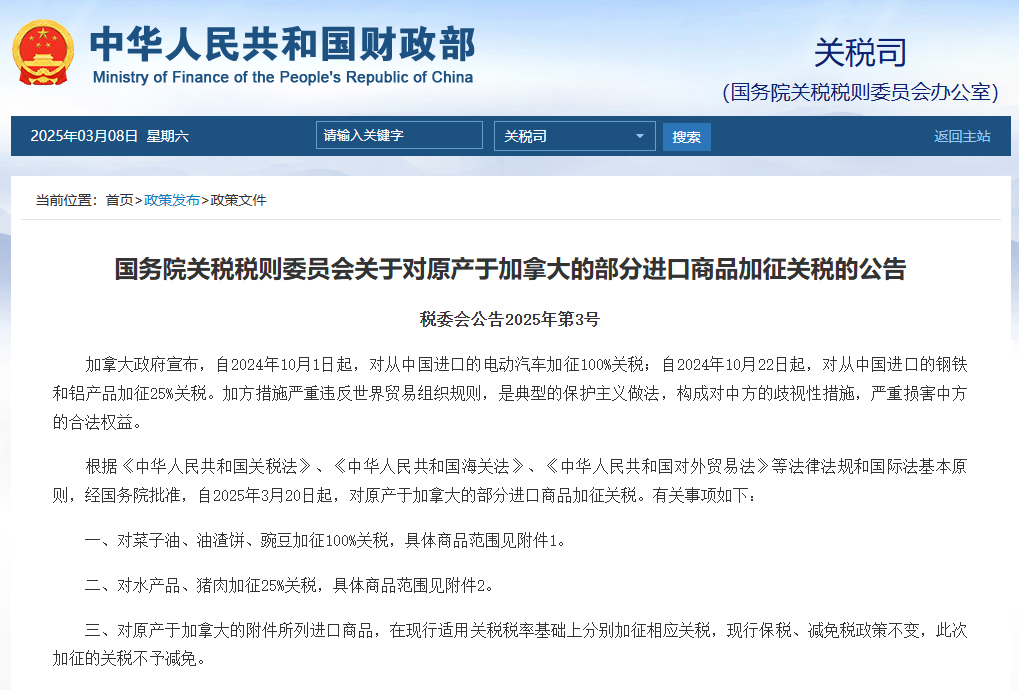 根據《中華人民共和國關稅法》、《中華人民共和國海關法》、《中華人民共和國對外貿易法》等法律法規和國際法基本原則,經國務院批准,國務院關稅稅則委員會發布公告,自2025年3月20日起,對原產於加拿大的菜子油、油渣餅、豌豆加徵100%關稅;對原產於加拿大的水產品、豬肉加徵25%關稅。