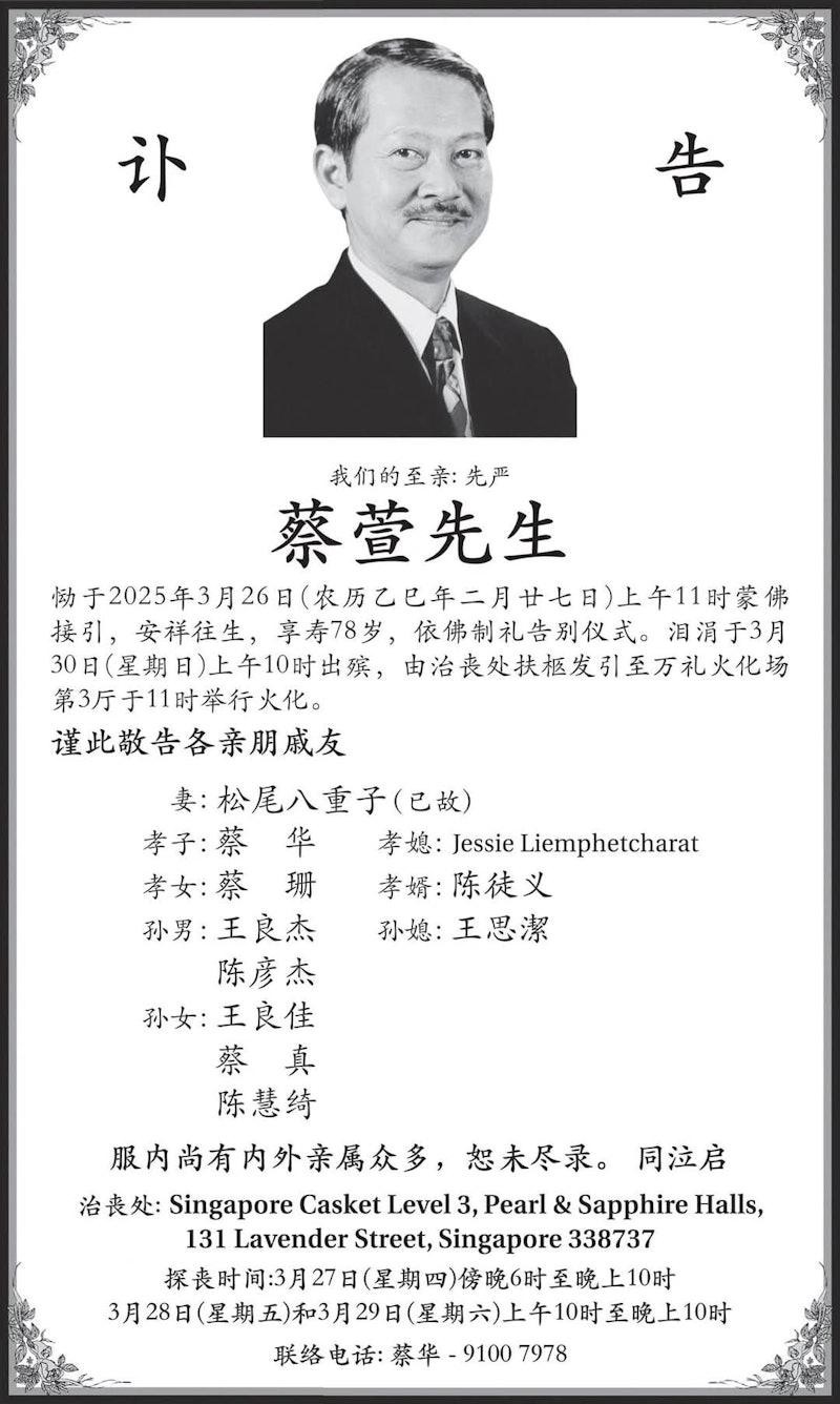 蔡萱的兒子蔡華證實父親的死訊,指爸爸生前患有輕微的骨髓纖維化,2月病情開始惡化,演變成急性白血病,25日覆診時感到呼吸困難和氣喘,被送入急症室。26日,蔡萱不幸病逝。蔡瀾亦因為身體抱恙,無法前往新加坡出席弟弟的喪禮。