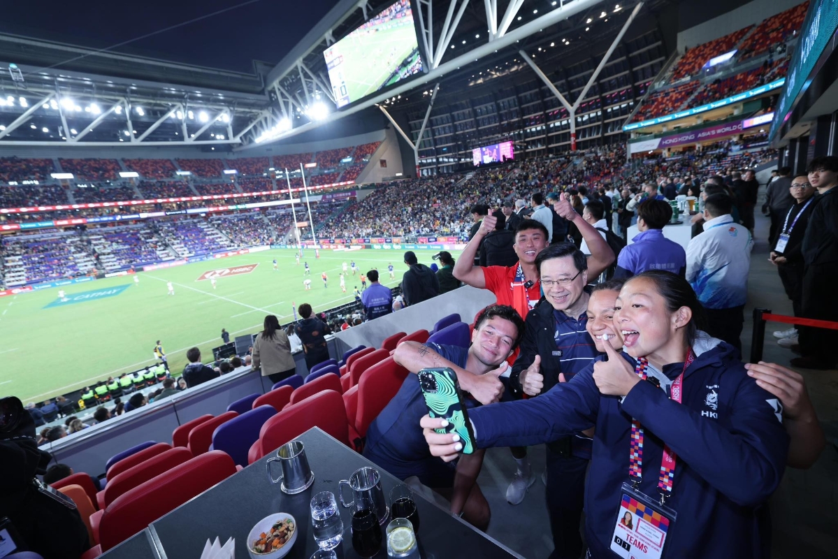 香港新聞網3月30日電 香港特區行政長官李家超30日表示,當日懷著興奮心情,前往觀看首度移師啟德體育園舉行的香港國際七人欖球賽。他和太太與全場數萬名觀眾一起盡情狂歡、為運動員吶喊。“南看台”觀眾盛裝打扮,既有比賽看又有樂隊表演,大家隨著音樂搖擺起舞,推高派對氣氛。