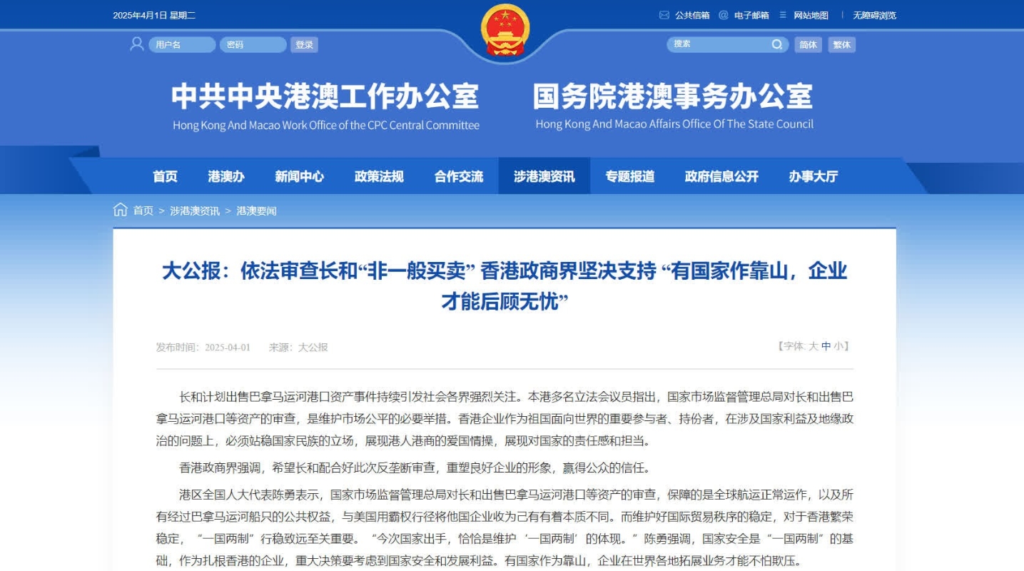 香港新聞網4月1日電 國務院港澳辦4月1日繼續轉發香港大公報文章,引述多名立法會議員指出,國家市場監督管理總局對長和出售巴拿馬運河港口等資產的審查,是維護市場公平的必要舉措。以下為原文: