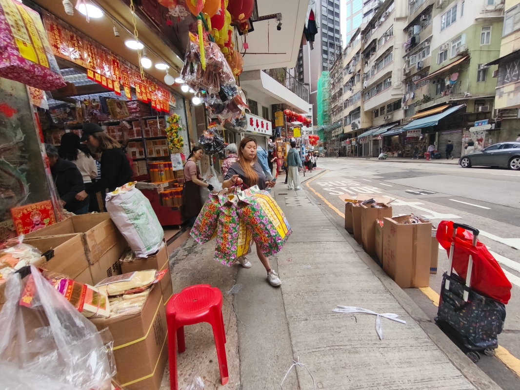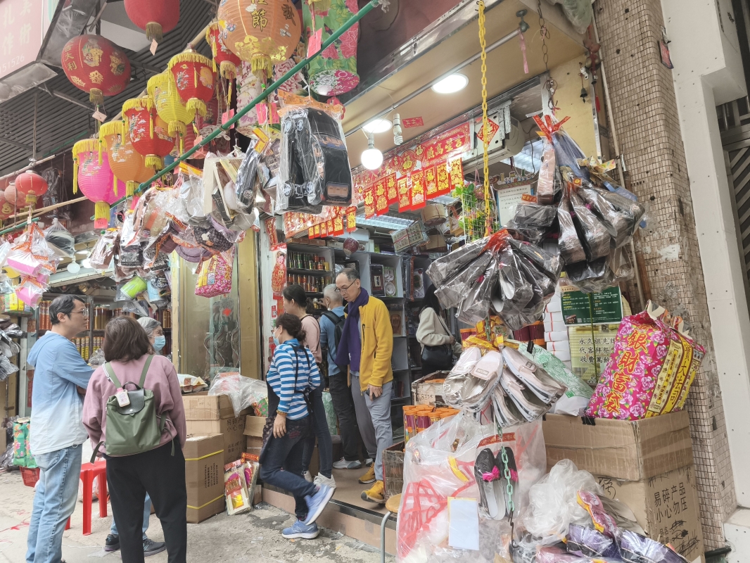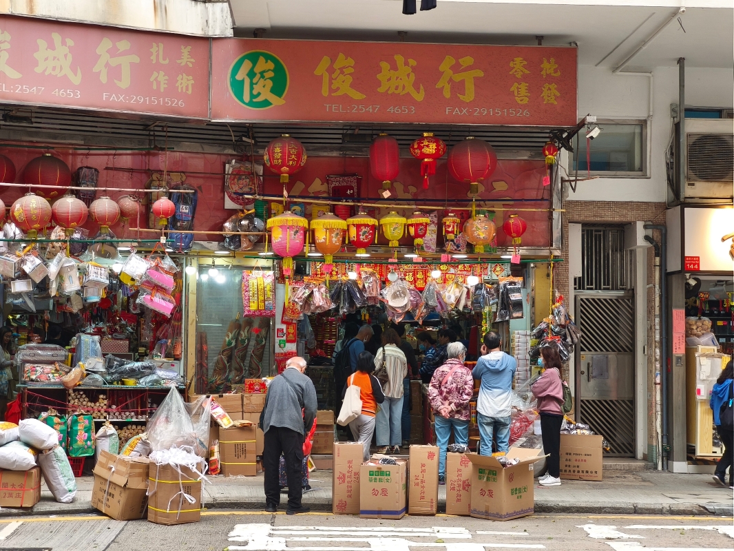 在西環幾家老字號紙紮店鋪門外更有顧客排隊等候購買祭品(許其皓攝)