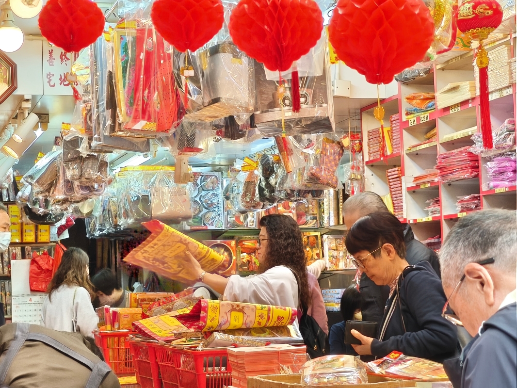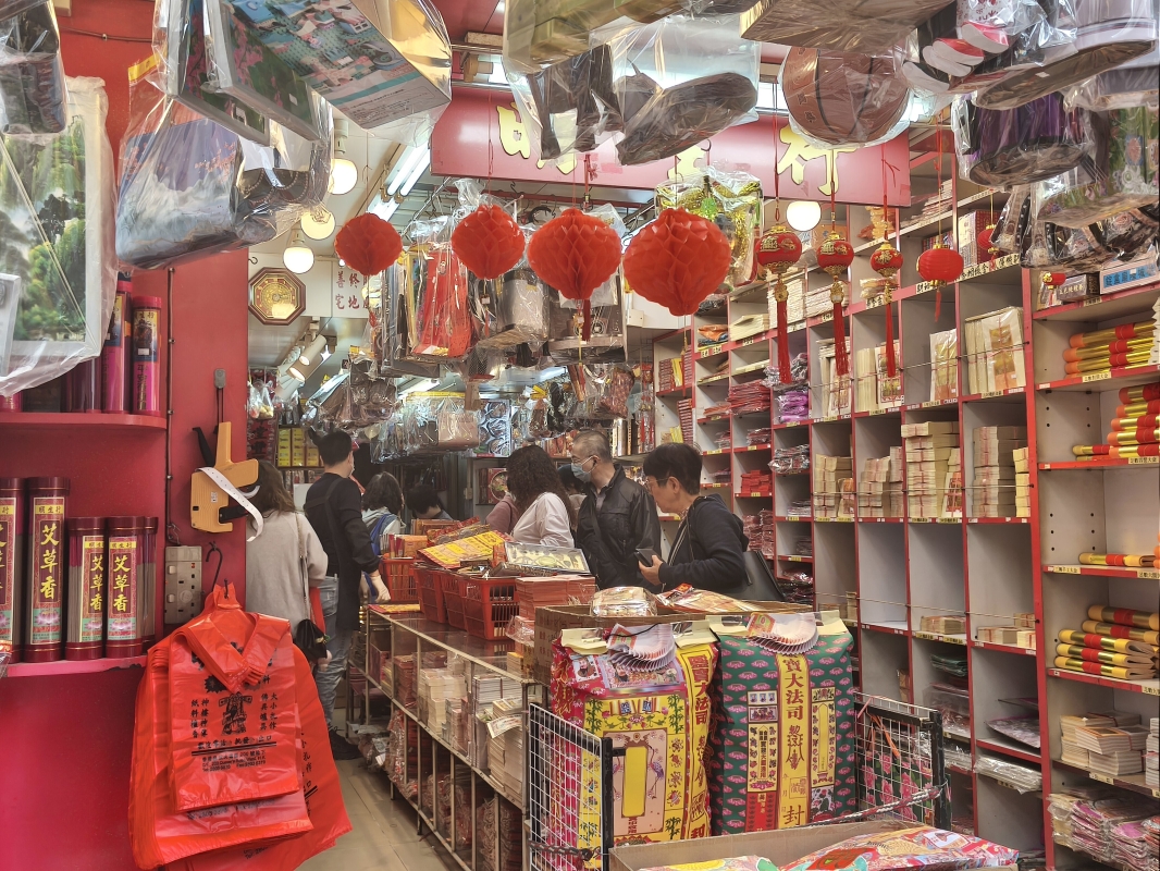 西環紙紮店鋪店員都忙個不停,門外更有顧客排隊等候購買祭品(許其皓攝)
