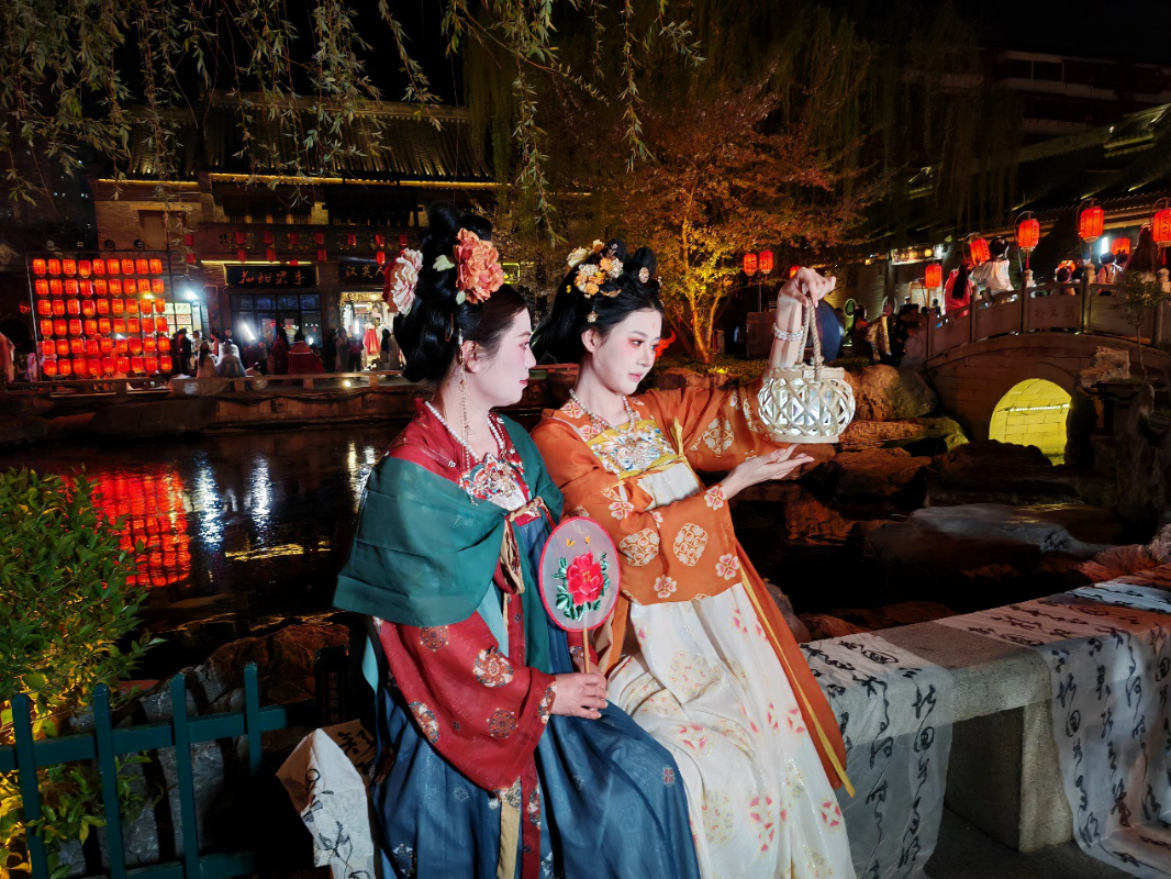 兩名漢服遊人在洛陽洛邑古城賞玩。董非攝