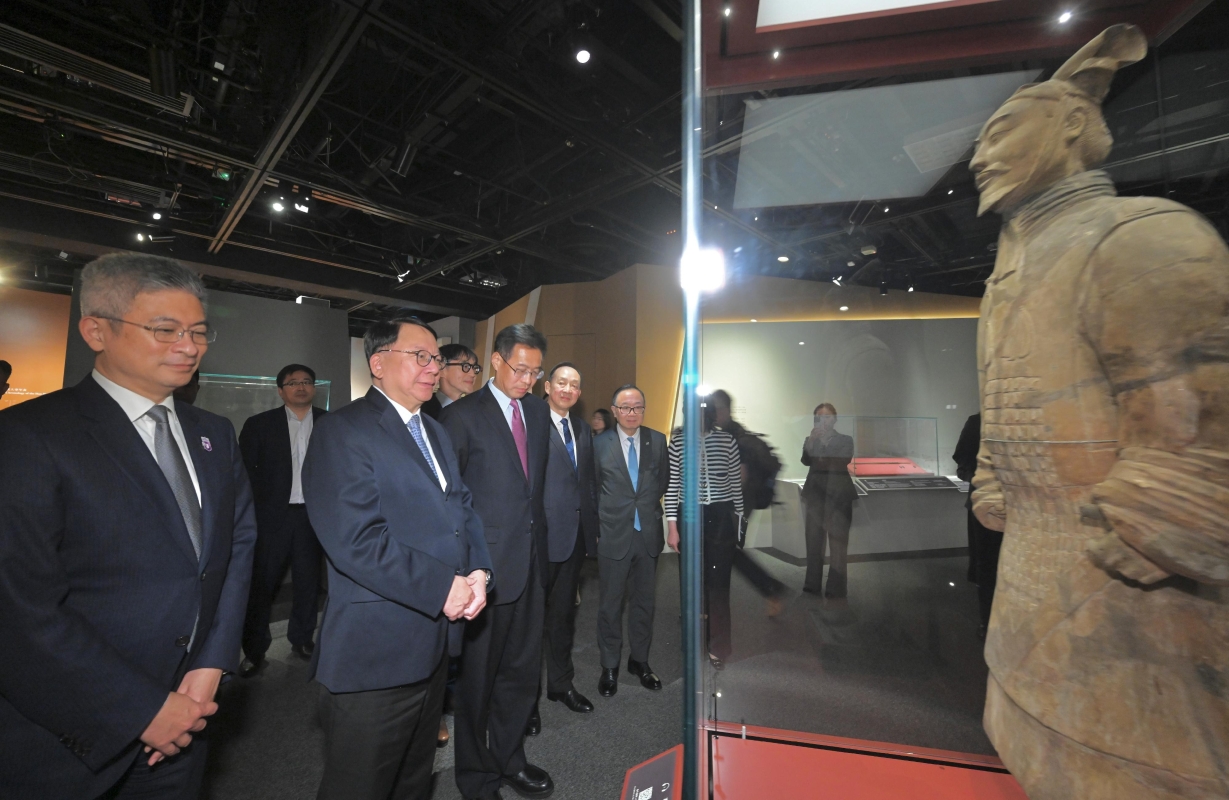 香港特區政府政務司司長陳國基今日(四月十五日)出席“香港賽馬會呈獻系列:天下一統—陝西秦漢文明展”開幕典禮。圖示陳國基(左二)參觀展覽。香港特區政府新聞處圖片