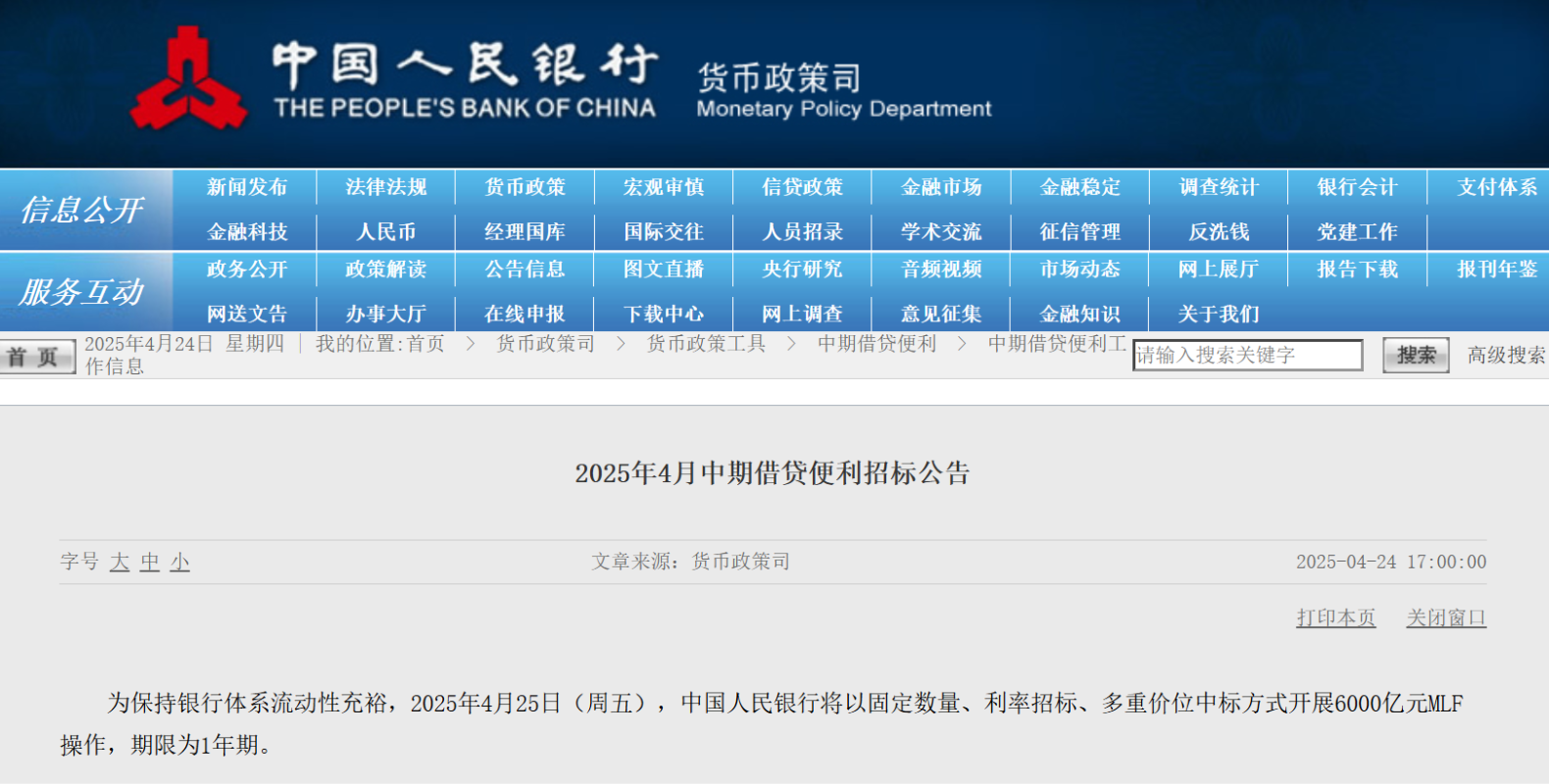 香港新聞網4月25日電 據中國人民銀行(央行)24日公告,為保持銀行體系流動性充裕,25日,中國人民銀行將以固定數量、利率招標、多重價位中標方式開展6000億元MLF(中期借貸便利)操作,期限為1年期。