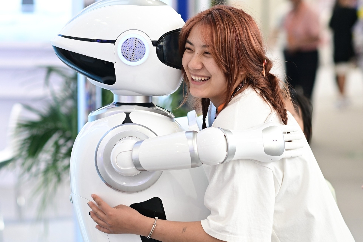 資料圖:參觀者在北京首鋼園展區與機器人擁抱。 香港中通社圖片
