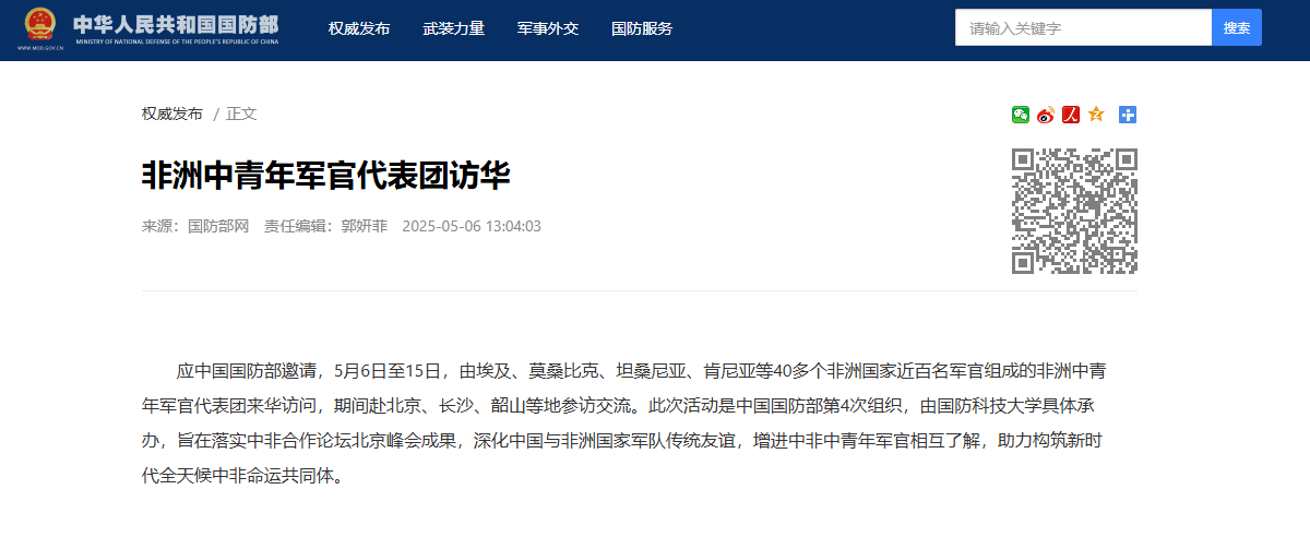 香港中通社5月6日電 據“國防部發布”微信公眾號6日消息,應中國國防部邀請,5月6日至15日,由埃及、莫桑比克、坦桑尼亞、肯尼亞等40多個非洲國家近百名軍官組成的非洲中青年軍官代表團來華訪問,期間赴北京、長沙、韶山等地參訪交流。