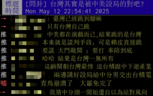部分“青鳥”難以接受眼前的事實,在島內論壇PTT上發佈帖子,堅稱這是中美故意設下的騙局,目的是讓台灣成為大的輸家。他們還妄自揣測,美國發起關稅戰真正的目的就是為了從台灣搶走台積電。