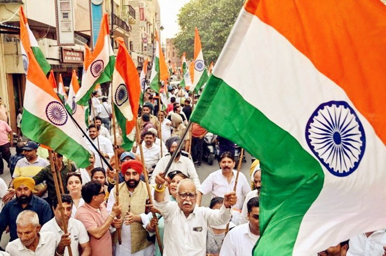 2025年5月17日,印度阿姆利則,人們高舉印度國旗,慶祝軍隊對巴基斯坦的打擊行動。社交媒體臉書資料圖