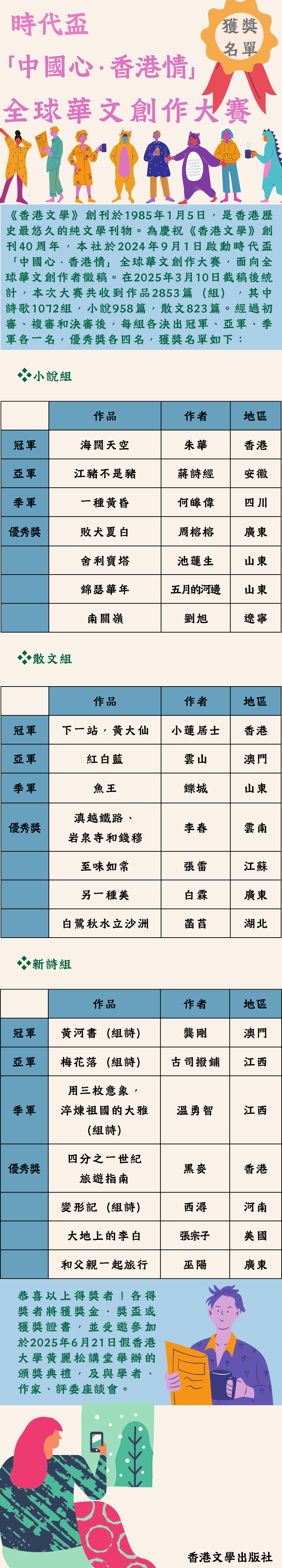 獲獎名單顯示,小說組冠軍為香港作者朱華的《海闊天空》,散文組冠軍為香港作者小蓮居士的《下一站,黃大仙》,詩歌組冠軍為澳門作者龔剛的黃河書(組詩)。三個組別的評委主任分別為陝西省作家協會主席賈平凹,中國作家協會副主席邱華棟,文藝評論家、詩人、作家謝冕。