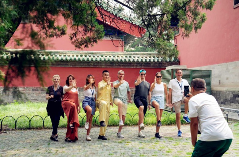圖為外國遊客在北京頤和園景區內和太極拳老師合影留念。新華社資料圖