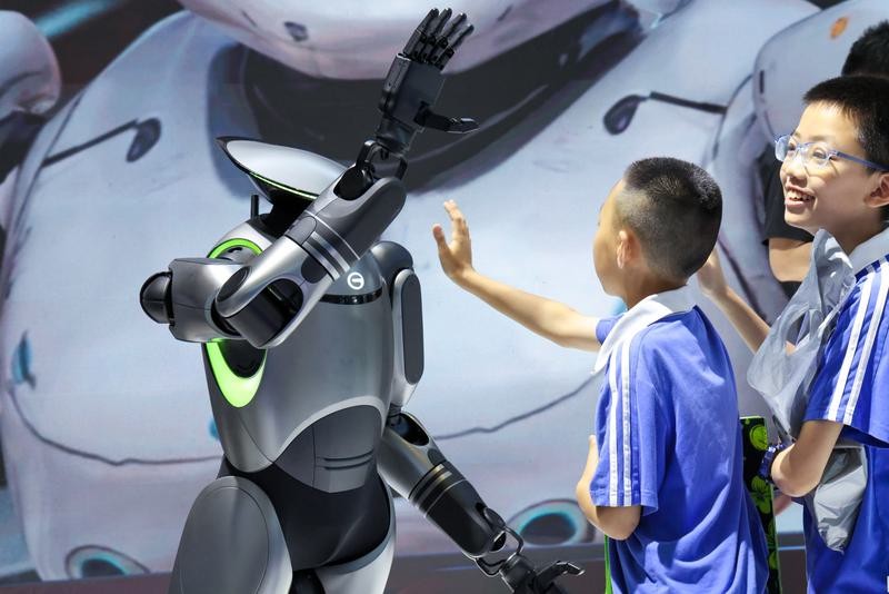 5月23日,孩子們在文博會上與機器人互動。圖片來源:新華社