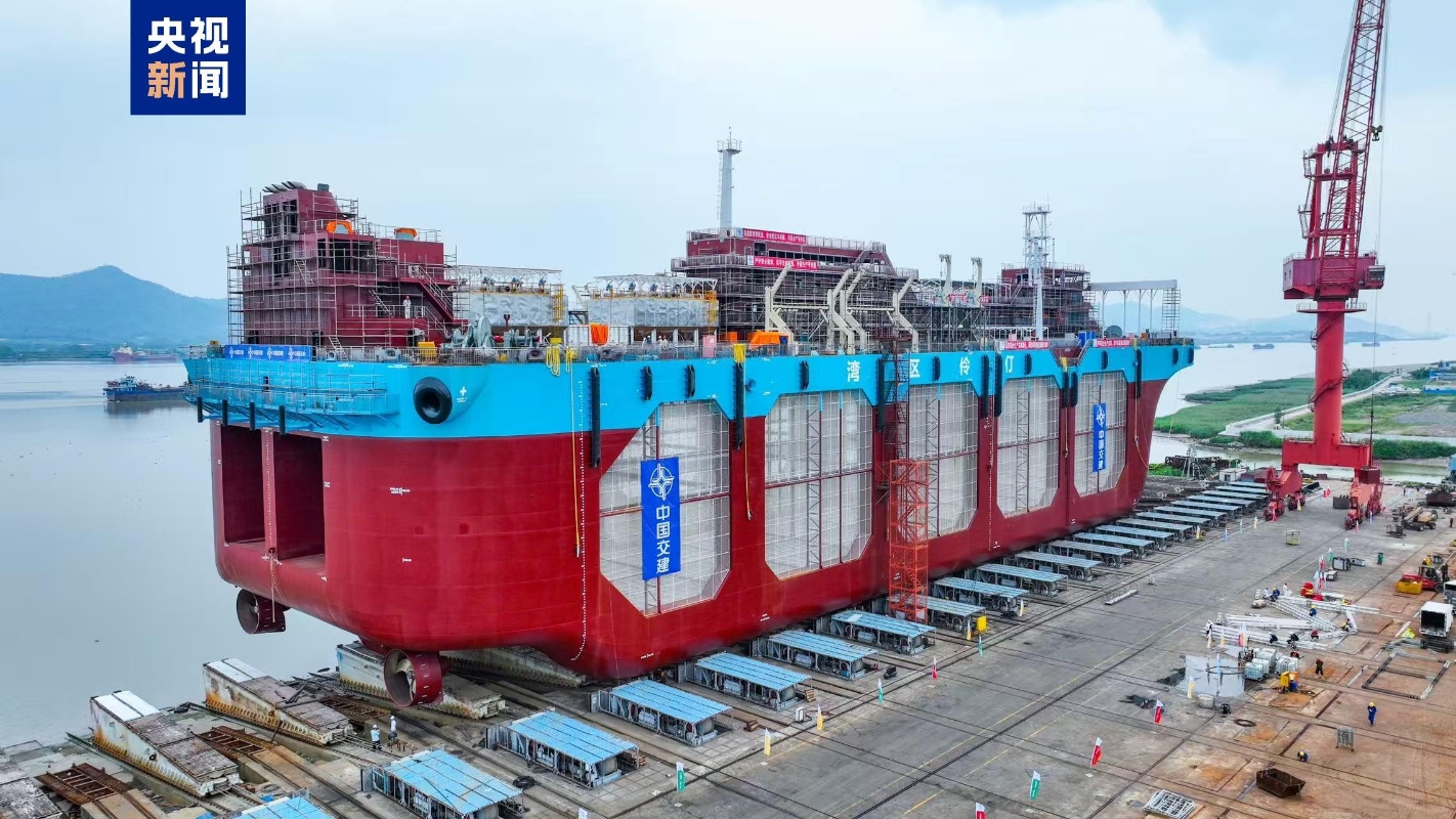 5月27日,“灣區伶仃”號深海養殖工船在廣東江門下水。央視新聞圖片