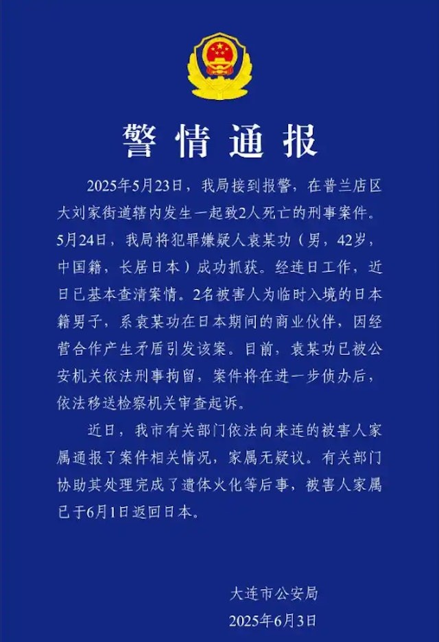 香港中通社6月3日電 6月3日,中國遼寧省大連市公安局通報:5月23日,該局接到報警,在普蘭店區大劉家街道轄內發生一起致2人死亡的刑事案件。5月24日,警方將犯罪嫌疑人袁某功(男,42歲,中國籍,長居日本)成功抓獲。