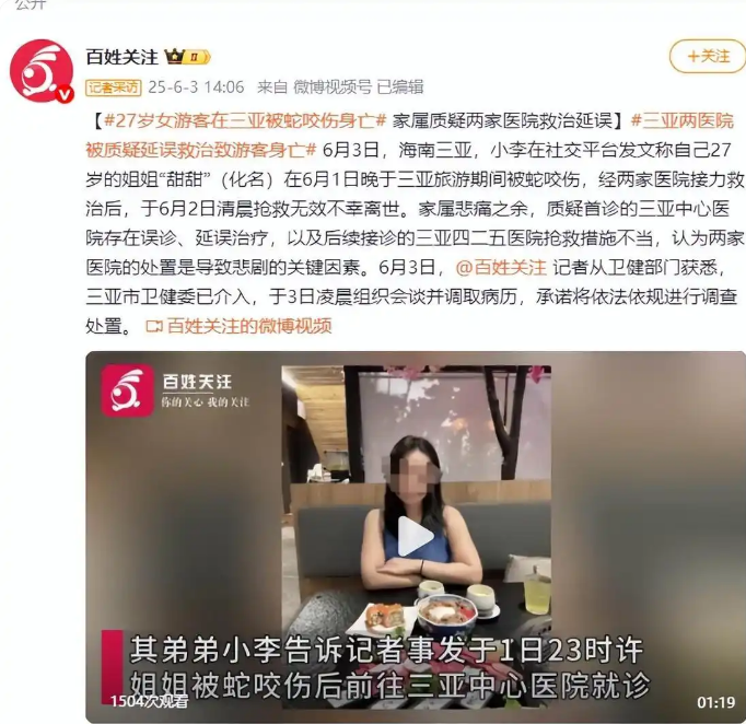 香港新聞網6月3日電 6月3日,海南三亞,一名李姓先生在社交平台發文稱自己27歲的姐姐“甜甜”(化名)在6月1日晚於三亞旅遊期間被蛇咬傷,經兩家醫院接力救治後,於6月2日清晨搶救無效不幸離世。