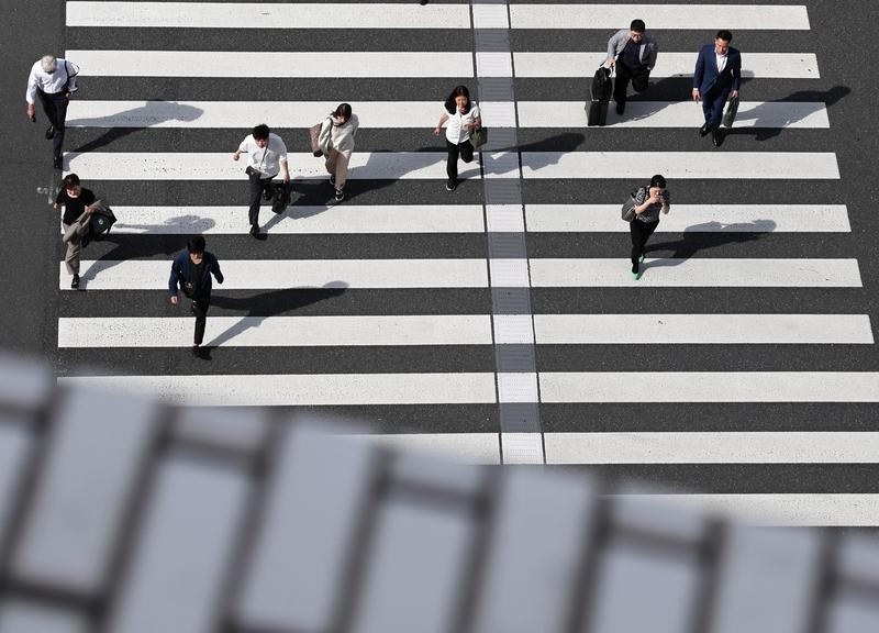 5月15日,在日本東京,行人通過東京站附近的一處人行橫道。圖片來源:新華社