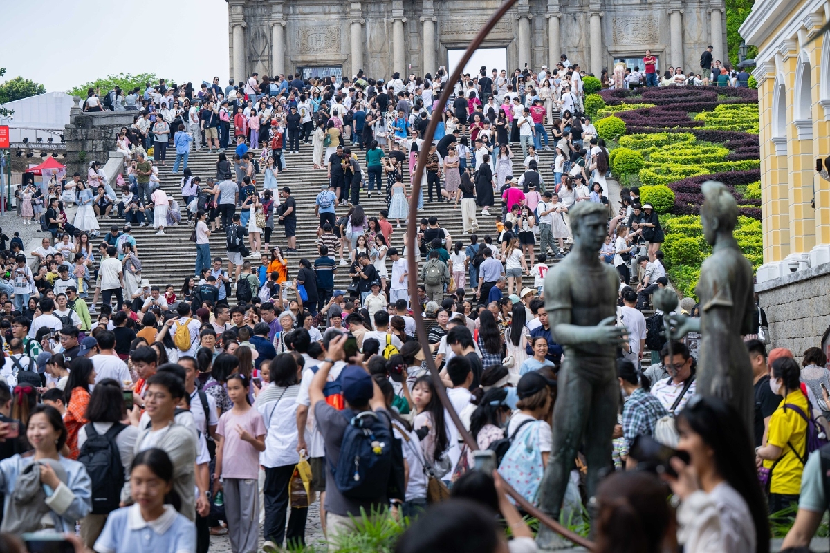 資料圖:旅客在澳門大三巴牌坊前觀光。香港中通社圖片