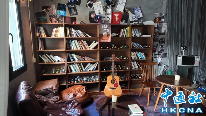 “小號地段”酒館內,布置的開展“以書換酒”活動的角落。 香港中通社圖片