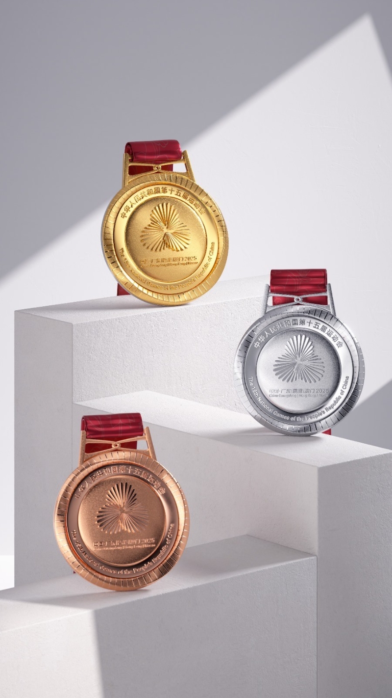 其中,競技體育項目獎牌重354.5 克,一面正中上方的會徽由代表粵港澳三地的花瓣交叠扭轉形成同心禮花,下方牡丹花托舉而上,寓意粵港澳大灣區依託祖國的堅實後盾蓬勃發展,為民族復興貢獻力量。另一面中間的吉祥物中華白海豚手舉火炬,靈動活潑,周圍浪濤造型的數字“15”巧妙地將全運會屆別與體育精神的傳承完美結合。