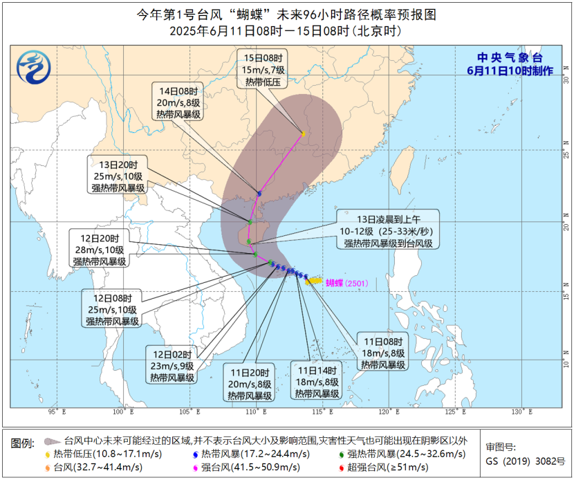 中國中央氣象台發布颱風藍色預警:預計“蝴蝶”將以每小時10-15公里的速度向西偏北方向移動,強度緩慢加強,逐漸向海南島南部沿海靠近,並於13日凌晨到上午在上述沿海登陸(強熱帶風暴級到颱風級,10-12級,25-33米/秒),之後有可能於13日夜間在廣東西部到廣西沿海再次登陸(熱帶風暴級到強熱帶風暴級,8-10級,20-25米/秒),登陸後轉向東北方向移動,強度逐漸減弱。