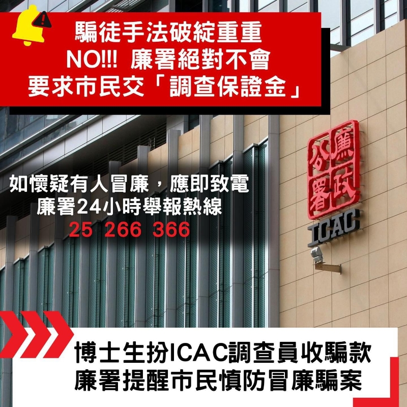 騙徒行騙手法根本破綻重重,市民切勿誤墮騙局。如懷疑有人冒認廉署人員,應立即致電廉署24小時舉報熱線25 266 366查詢或舉報。(完)
