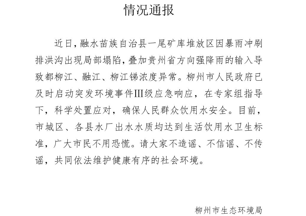 柳州市生態環境局6月24日發布通報稱,近日,融水苗族自治縣一尾礦庫堆放區因暴雨衝刷排洪溝出現局部塌陷,叠加貴州省方向強降雨的輸入導致都柳江、融江、柳江銻濃度異常。柳州市政府已及時啟動突發環境事件Ⅲ級應急響應,在專家組指導下,科學處置應對,確保人民群眾飲用水安全。