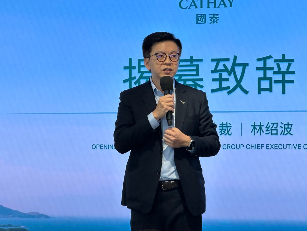 國泰集團行政總裁林紹波進行揭幕儀式致辭。香港中通社記者 俞丹鳳攝