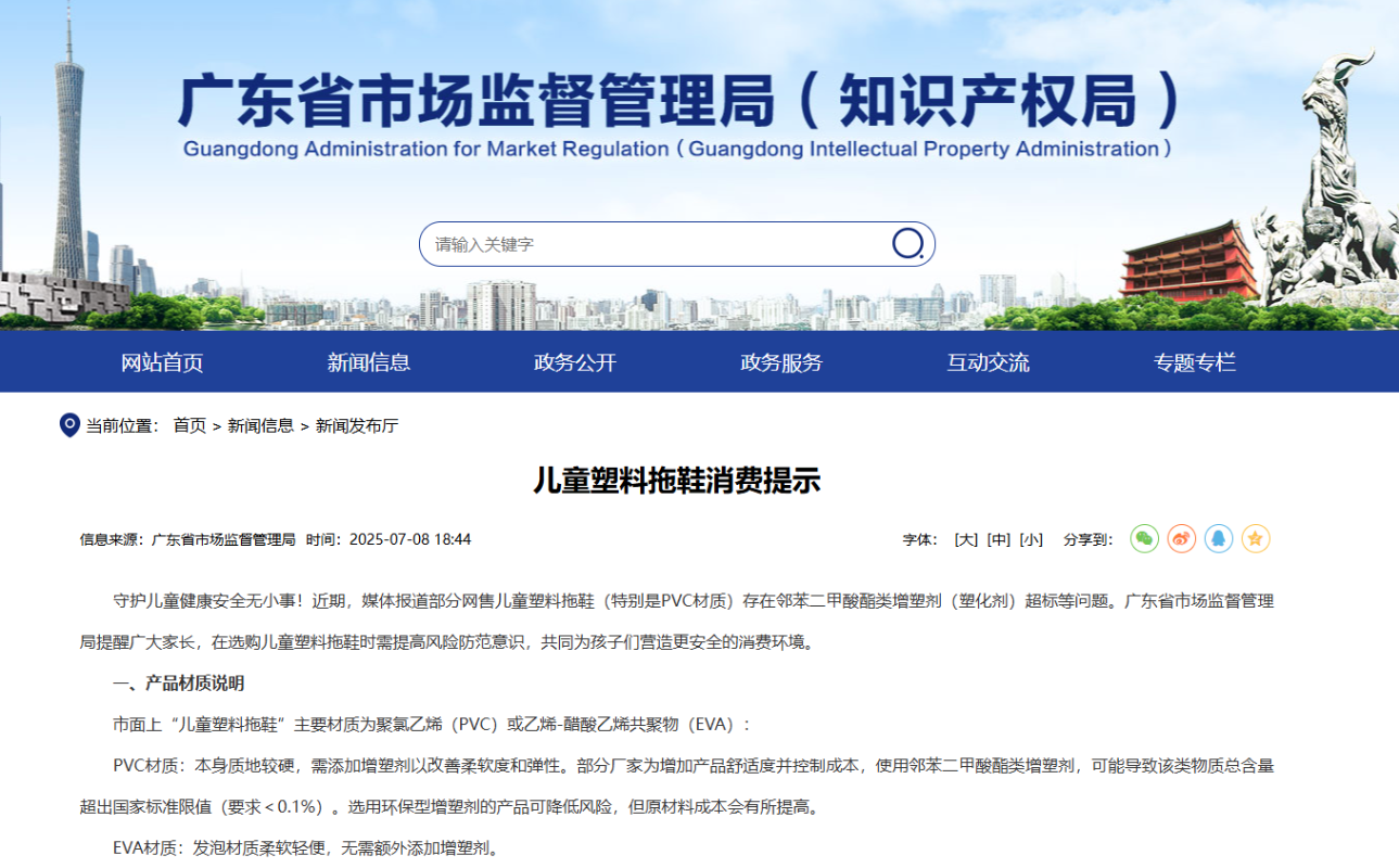 廣東省市場監督管理局8日表示,EVA材質拖鞋每雙低於11元(人民幣,下同)、PVC材質拖鞋每雙低於7元需警惕。專家建議,選購時優先選擇EVA材質或標明使用環保增塑劑的產品,並關注產品標識和合規性,以保障兒童健康安全。