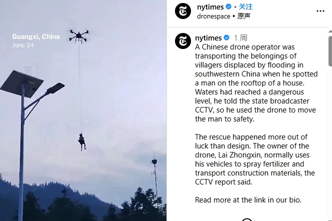 美媒《紐約時報》也注意到中國運用高科技裝備救災一事,並發佈了一段有關中國無人機救災的視頻。在視頻評論區,一眾外國網友熱情稱讚中國的無人機技術,“太酷了”“中國正在贏得創新競賽”,還有網友表示,“看到無人機以人道主義方式使用,而不是死亡和破壞,讓人感到欣慰”。