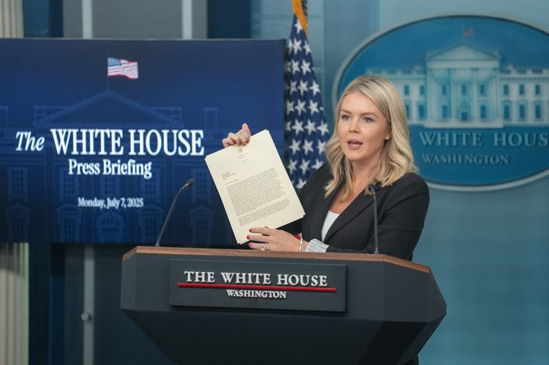 7月7日,在美國首都華盛頓白宮,白宮新聞發言人卡羅琳·萊維特在記者會上展示美國總統特朗普致日本首相的信函。 圖片來源:新華社
