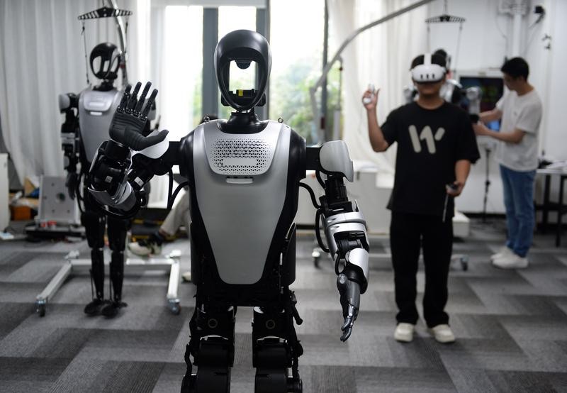 資料圖:在樂聚(深圳)機器人技術有限公司,工作人員在操控機器人同步動作。圖片來源:新華社
